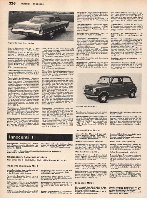 Lizenzmodell des BMC ADO 15 Station Wagon. Debüt Turin 1966. In der Schweiz nicht lieferbar. Daten wie Innocenti Mini Minor Mk. 3, mit folgenden Ausnahmen: