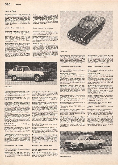 Mittelklassewagen mit Frontantrieb, rundum Einzelradaufhängung und Vierrad-Scheibenbremsen. Wahl zwischen vier Fiat-Vierzylindermotoren von 1,3, 1,4, 1,6 und 1,8 Liter. 5-Gang- Getriebe. Nachfolgemodell des Lancia Fulvia Berlina. Debüt Limousine Herbst 1972, Coupé Juni 1973, Beta 1300 Turin 1974