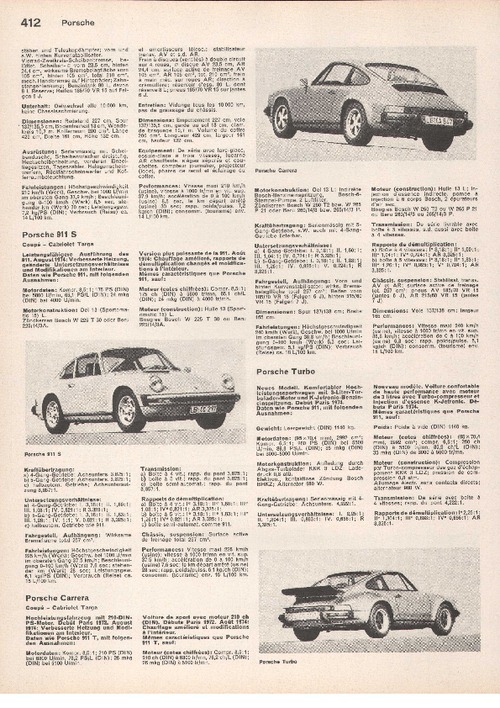 Neues Modell. Komfortabler Hochleistungssportwagen mit 3-Liter-Turbolader-Motor und K-Jetronic-Benzineinspritzung. Debüt Paris 1974. Daten wie Porsche 911, mit folgenden Ausnahmen:
