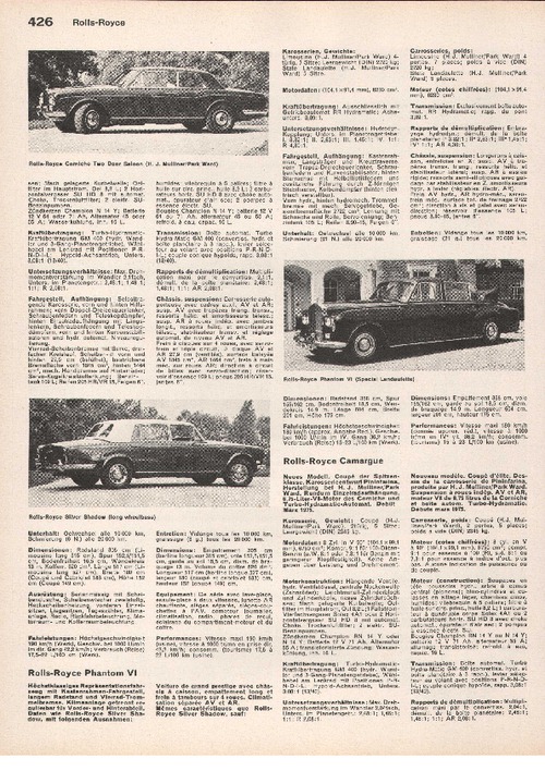 Höchstklassiges Repräsentationsfahrzeug mit Kastenrahmen-Fahrgestell, langem Radstand und Vierrad-Trommelbremse. Klimaanlage getrennt regulierbar für Vorderund Hinterabteil. Daten wie Rolls-Royce Silver Shadow, mit folgenden Ausnahmen: