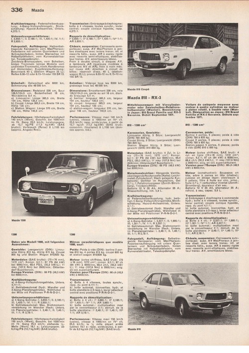 Mittelklassewagen mit Vierzylindermotor oder Zweischeiben-Rotationskolbenmotor (Wankel). Bezeichnung in Japan: 818 Grand Familia und RX-3 Savanna. Debüt September 1971
