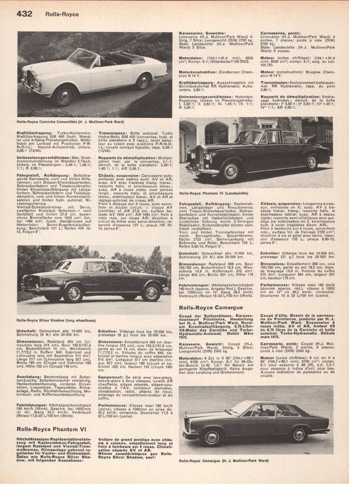 Höchstklassiges Repräsentationsfahrzeug mit Kastenrahmen-Fahrgestell, langem Radstand und Vierrad-Trommelbremse. Klimaanlage getrennt regulierbar für Vorderund Hinterabteil. Daten wie Rolls-Royce Silver Shadow, mit folgenden Ausnahmen: