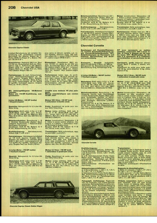 Sportwagen mit Kunststoffkarosserie, hinterer Einzelradaufhängung sowie Vierrad-Scheibenbremsen. 1977: Detailänderungen an Karosserie und Interieur; Servolenkung und -bremsen serienmässig.5,7-Liter-V8-Motor - 180 HP (netto) 1 Vierfachvergaser