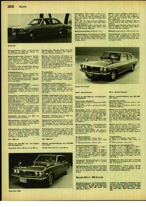 Mittelklassewagen mit Zweischeiben- Rotationskolbenoder 1,8-Liter-Vierzylindermotor. Debüt RX-4 (Wankelmotor) Tokio 1972, 929 April 1973. 1976: Neue Front