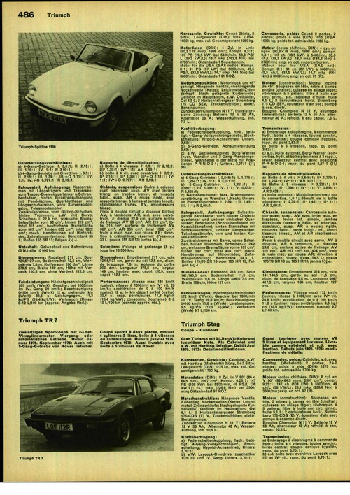 Zweisitziges Sportcoupé mit 2-Liter- Vierzyiindermotor, Viergangoder automatisches Getriebe. Debüt Januar 1975. September 1976: Auch mit 5-Gang-Getriebe von Rover lieferbar.Triumph TR 7
