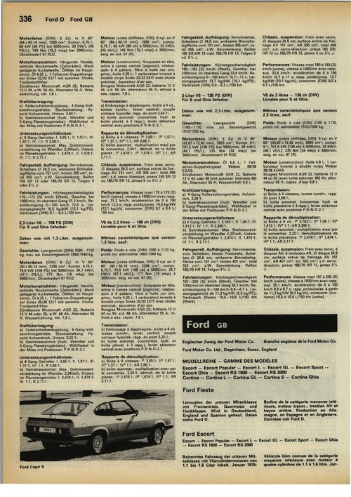 Limousine der unteren Mittelklasse, Frontantrieb, 1-Liter-Motor mit 40 oder 45 DIN-PS, 1,1-Liter-Motor mit 53 PS. Vier Ausstattungsvarianten: Fiesta, L, S und Ghia. Debüt Ende Juni 1976, 1.3 Herbst 1977.1 -Liter - 40/45 PS (DIN) Serienmässig für Fiesta, Fiesta L und Fiesta Ghia