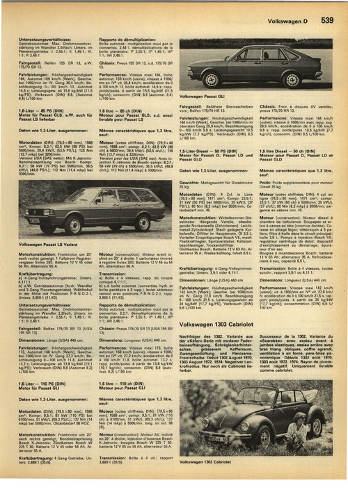 Nachfolger des 1302. Variante aus der «Käfer»-Serie mit vorderer Federbeinaufhängung, Schräglenkerhinterachse, grosserem Kofferraum, Zwangsentlüftung und Panorama- Frontscheibe. Debüt 1302 August 1970, 1303 August 1972. 1974: Negativer Lenkrollradius. Nur noch als Cabriolet lieferbar