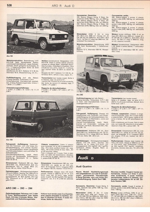 Neues Modell. Coupé mit Allradantrieb, 5-Zylinder-Motor mit Einspritzung und Abgasturbolader, aus dem Audi 80 für die Homologation im Rallyesport entwickelt. Debüt Genf 1980.