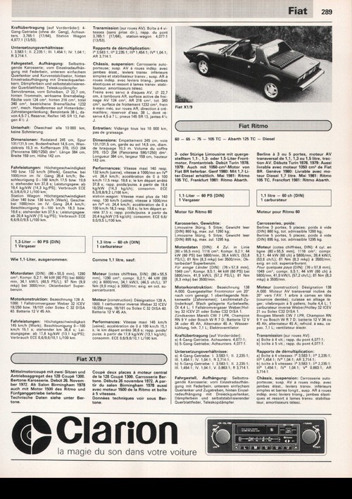 3- oder 5türige Limousine mit quergestelltem 1,1-, 1,3- oder 1,5-Liter-Frontmotor, Frontantrieb. Debüt Turin 1978. 1979: Auch mit 1050-cm3-Motor von Fiat BR lieferbar. Genf 1980: Mit 1,7-Liter Diesel erhältlich. Mai 1981: Ritmo 105 TC, Frankfurt 1981: Ritmo Abarth.1,1-Liter - 60 PS (DIN) 1 Vergaser