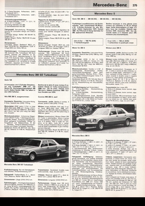 Fünfsitzige Luxuslimousine mit Sechszylinderoder Leichtmetall-V8 Motor, a.W. 4-Stufen-Automat für alle Modelle. Debüt September 1979. Herbst 1981: Auf Wunsch 5-Gang-Getriebe für 280, sparsamere Motoren.2,8-L-6-Zyl. - 156 PS (DIN) 1 Vierfachvergaser