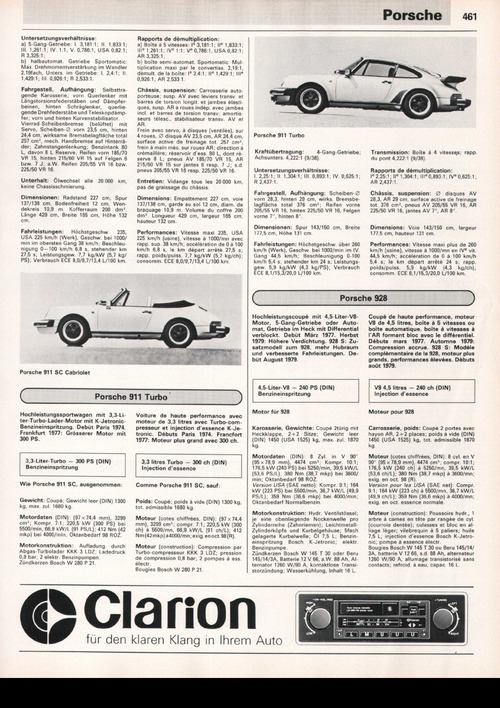 Hochleistungssportwagen mit 3,3-Liter-Turbo-Lader-Motor mit K-Jetronic- Benzineinspritzung. Debüt Paris 1974. Frankfurt 1977: Grösserer Motor mit 300 PS.3,3-Liter-Turbo - 300 PS (DIN) Benzineinspritzung