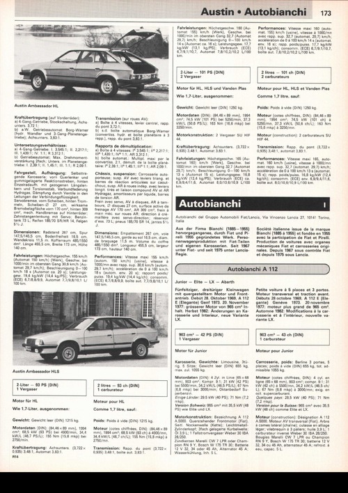 Funfsitziger, dreitüriger Kleinwagen mit quergestelltem Motor und Frontantrieb. Debüt 28. Oktober 1969, A 112 E (Elegante) Genf 1973. 20. November 1977: grösserer Motor von 965 cm3 Inhalt. Herbst 1982: Änderungen an Karosserie und Interieur, neue Variante LX.903 cm3 - 42 PS (DIN) 1 Vergaser