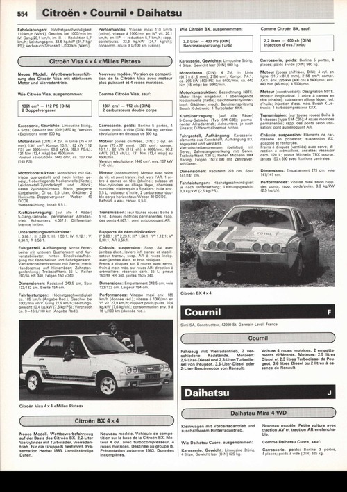 Neues Modell. Wettbewerbsfahrzeug auf der Basis des Citroën BX. 2,2-Liter Vierzylinder mit Turbolader, Vierradantrieb. Für die Gruppe B bestimmt. Präsentation Herbst 1983. Unvollständige Daten.