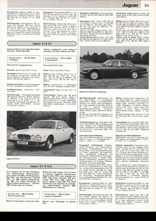 XJ Limousine mit 5,3-Liter-V12-Motor und elektronischer Benzineinspritzung. Debüt Juli 1972, mit Einspritzung Mai 1975, mit GM-Automat Frühling 1977. Für 1981 digitale Einspritzung. Juli 1981: H.E. (High Efficiency) mit «May-Fireball »Brennraum. Oktober 1982: Änderungen im Interieur.5,3-Liter-V12 - 295 PS (DIN) Benzineinspritzung