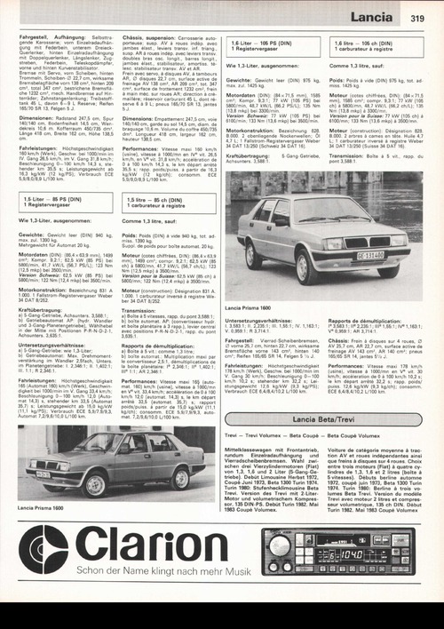 Mittelklassewagen mit Frontantrieb, rundum Einzelradaufhängung und Vierradscheibenbremsen. Wahl zwischen drei Vierzylindermotoren (Fiat) von 1,3, 1,6 und 2 Liter (5-Gang-Getriebe). Debüt Limousine Herbst 1972, Coupé Juni 1973, Beta 1300 Turin 1974. Turin 1980: Stufenhecklimousine Beta Trevi. Version des Trevi mit 2-Liter- Motor und volumetrischem Kompressor, 135 DIN-PS. Debüt Turin 1982. Mai 1983 Coupé Volumex.1,4-Liter - 84 PS (DIN) 1 Registervergaser