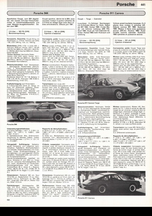 Luxuriöser, 2 + 2sitziger Sportwagen mit 6-Zylinder-Motor im Heck. Debüt als 901 1963. Herbst 1980: 3-Liter-Motor mit höherer Leistung (204 PS). Genf 1982: Auch als Voll-Cabriolet lieferbar. Herbst 1983 mehr Hubraum und Leistung.3,2-Liter - 231 PS (DIN) Benzineinspritzung