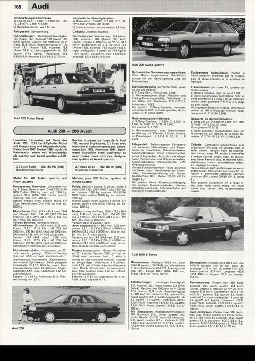 Luxuriöse Limousine auf Basis des Audi 100; 2.1 Liter 5 Zylinder Motor mit Einspritzung und Abgasturbolader. Debüt Juni 1983. Herbst 1984: auch mit Katalysator sowie mit Allradantrieb als quattro und Avant quattro erhältlich.2,1-Liter Turbo - 182/165 PS (DIN) Benzineinspritzung