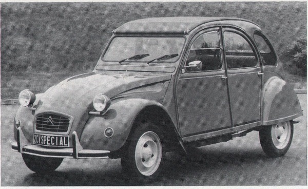 Wirtschaftlicher Kleinwagen mit Frontantrieb und 2-Zylinder-Boxermotor. Debüt Paris 1948. Sommer 1979: nur noch mit 602 ern^ Motor lieferbar. Herbst 1980: modifizierter Vergaser, geringerer Verbrauch. Herbst 1983: a.W. mit grösserer Heckklappe. Herbst 1985: a.W. verringerte Verdichtung.Citroën 2 CV 6 Spécial602 cm3 - 29/28 PS (DIN) 1 Registervergaser