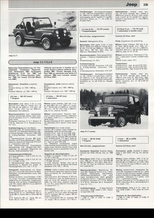 Bekanntes Geländefahrzeug mit Vierradantrieb. Verstärkter Kastenrahmen. Amsterdam 1981: Verlängerte Ausführung CJ-8. Für 1982 auf Wunsch mit 5 Gang Getriebe lieferbar. 1984 mit neuem 2,5-Liter-Motor von AMC.2,5-Liter - 105 HP (netto) 1 Vergaser
