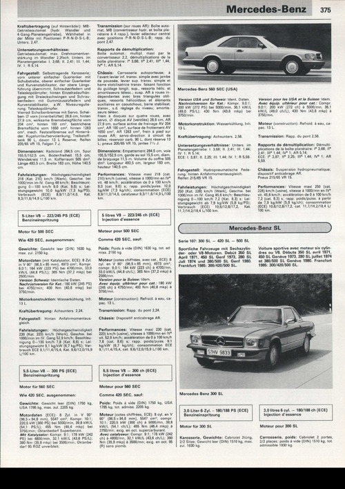 Serie 107: Sportliche Fahrzeuge mit Sechszylinderoder V8-Motoren. Debüt 350 SL April 1971, 450 SL Genf 1973, 280 SL Juli 1974 und 380/500 SL Genf 1980. Frankfurt 1985: 300/420/500 SL.Mercedes-Benz 300 SL3,0-Liter-6-Zyl. - 180/188 PS (ECE) Benzineinspritzung