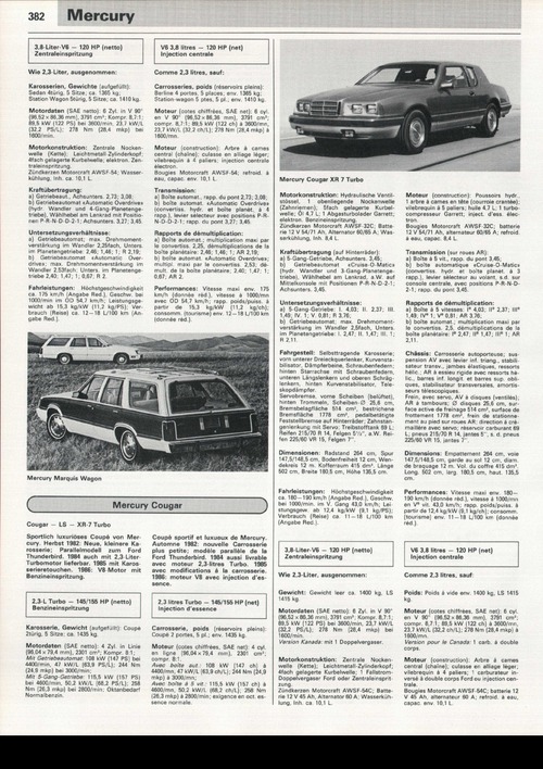 Sportlich luxuriöses Coupé von Mercury. Herbst 1982: Neue, kleinere Karosserie; Parallelmodell zum Ford Thunderbird. 1984 auch mit 2,3-Liter- Turbomotor lieferbar. 1985 mit Karos serieretouchen. 1986: V8 Motor mit Benzineinspritzung.2,3-L Turbo - 145/155 HP (netto) Benzineinspritzung