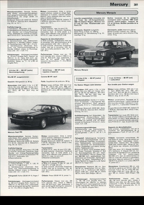 Luxuriös ausgestattete Limousine mit vier Türen der US Kompaktklasse. 1982 mit Station Wagon, Motoren von 2,3 und 3,8 Liter. Parallelmodell zum Ford LTD.2,3-Liter-4-Zyl. - 88 HP (netto) 1 Vergaser