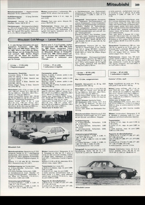 3-, 4- oder 5türige Limousine mit quer gestelltem Frontmotor, 1300, 1500, 1600 Turbo und 1800 Diesel. Debüt Tokio 1983. Wird in den USA als Mitsubishi Mirage und als Dodge/Plymouth Colt verkauft. 1985: Station Wagon Lancer auf der Basis der Frontantriebsmodelle, Katalysatorausführungen für Europa.1,3-Liter - 77 PS (JIS) 1 Registervergaser