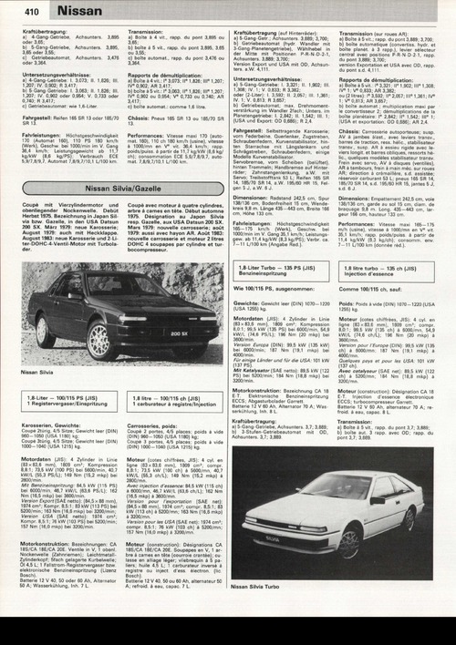 Coupé mit Vierzylindermotor und obenliegender Nockenwelle. Debüt Herbst 1975. Bezeichnung in Japan Silvia bzw. Gazelle, in den USA Datsun 200 SX. März 1979: neue Karosserie; August 1979: auch mit Heckklappe. August 1983: neue Karosserie und 2-Liter-DOHC-4-Ventil-Motor mit Turbolader.1,8-Liter - 100/115 PS (JIS) 1 Registervergaser/Einspritzung