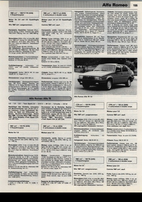 Nachfolger des Giulietta Limousine mit Benzinmotoren von 1,6 bis 2,5 Liter Hubraum, 2-Liter-Turbodiesel, Getriebe im Heck mit Differential verblockt, De-Dion-Hinterachse. Debüt Mai 1985, 1.8 turbo März 1986. Februar 1987: Neue Modelle «Twin Spark 2.0» und «6V 3.0».1567 cm3 - 110 PS (DIN) 2 Doppelvergaser
