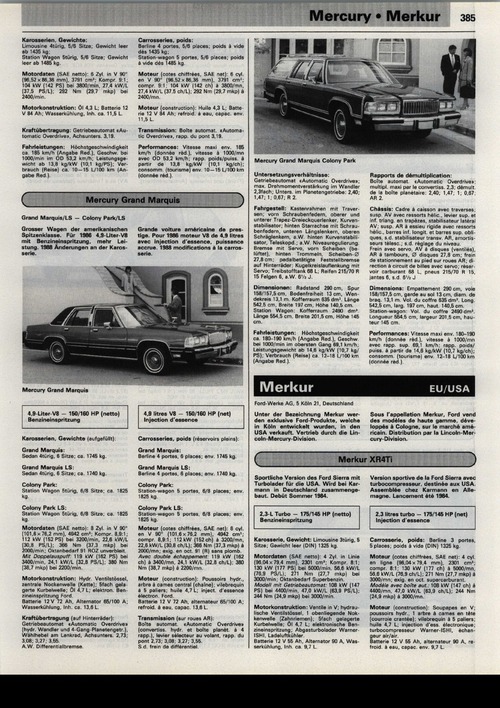 Grosser Wagen der amerikanischen Spitzenklasse. Für 1986 4,9 Liter V8 mit Benzineinspritzung, mehr Leistung. 1988 Änderungen an der Karos-Mercury Grand Marquis4.9-Liter-V8 - 150/160 HP (netto) Benzineinspritzung