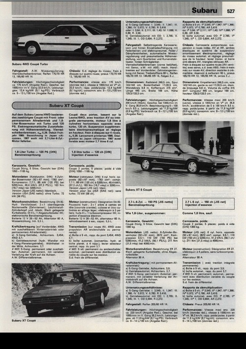 Auf dem Subaru Leone/4WD basierendes zweitüriges Coupé mit Frontoder permanentem Allradantrieb und 1,8- Liter-Boxermotor mit Turbo und 120 PS. Elektropneumatische Zusatzfederung mit Höhenverstellung, Vierradscheibenbremsen, Cv„ 0,29. Debüt Frühjahr 1985. Bezeichnung in Japan «Alcyone». 1987 auch mit 2,7-Liter-6-Zyl.- Motor lieferbar.1,8-Liter Turbo - 120 PS (DIN) Benzineinspritzung