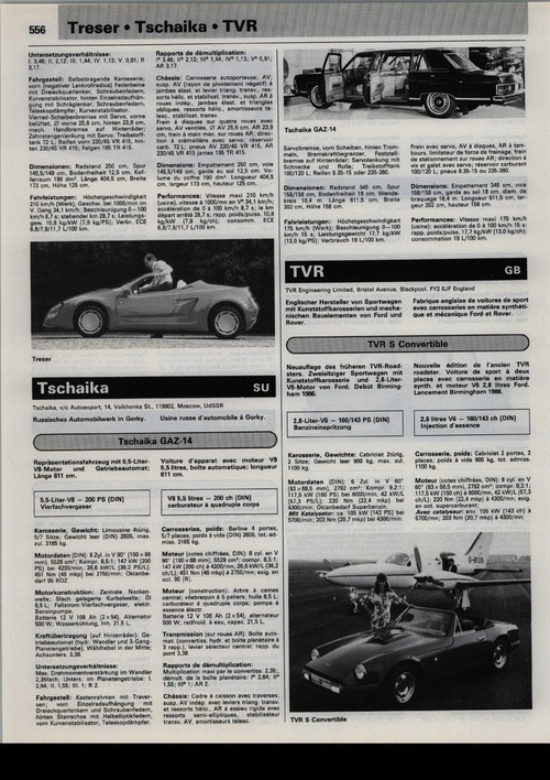 Neuauflage des früheren TVR-Roadsters. Zweisitziger Sportwagen mit Kunststoffkarosserie und 2,8-Liter- V6-Motor von Ford. Debüt Birmingham 1986.2,8-Liter-V6 - 160/143 PS (DIN) Benzineinspritzung