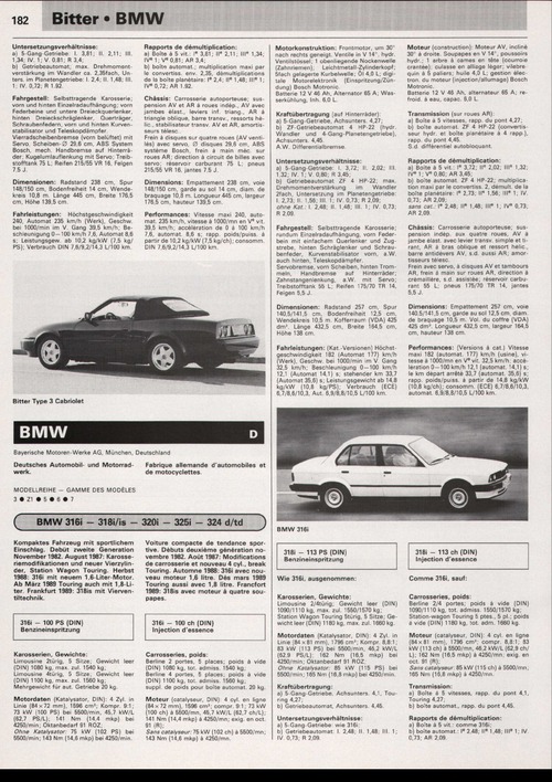 Kompaktes Fahrzeug mit sportlichem Einschlag. Debüt zweite Generation November 1982. August 1987: Karosseriemodifikationen und neuer Vierzylinder, Station Wagon Touring. Herbst 1988: 316i mit neuem 1,6-Liter-Motor. Ab März 1989 Touring auch mit 1,8-Liter, Frankfurt 1989: 318is mit Vierventiltechnik.
