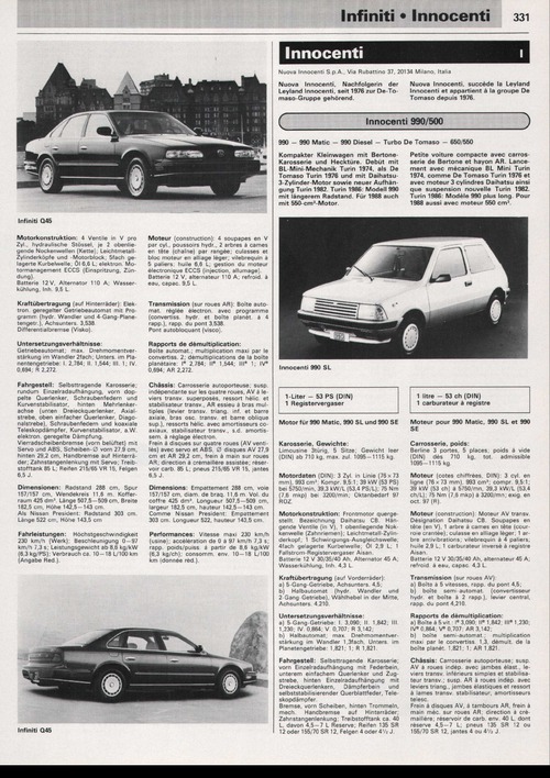 Kompakter Kleinwagen mit Bertone- Karosserie und Hecktüre. Debüt mit BL-Mini-Mechanik Turin 1974, als De Tomaso Turin 1976 und mit Daihatsu- 3-Zylinder-Motor sowie neuer Aufhängung Turin 1982. Turin 1986: Modell 990 mit längerem Radstand. Für 1988 auch mit 550-cm3-Motor.