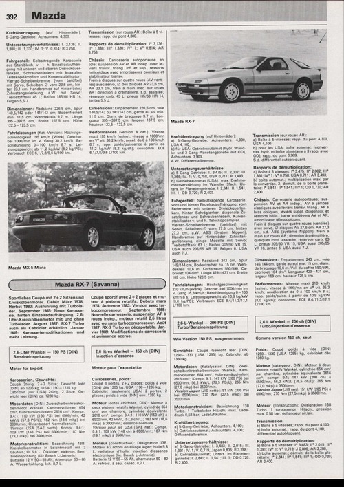 Sportliches Coupé mit 2 + 2 Sitzen und Kreiskolbenmotor. Debüt März 1978. Herbst 1983: Ausführung mit Turbolader. September 1985: Neue Karosserie, hinten Einzelradaufhängung, 2,6- Liter-Kreiskolbenmotor mit und ohne Turbolader. August 1987: RX-7 Turbo auch als Cabriolet erhältlich. Januar 1989: Karosseriemodifikationen und mehr Leistung.