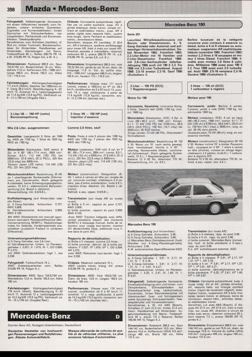 Serie 201: Luxuriöse Mittelklasselimousine mit Benzinoder Dieselmotoren, 4-, 5- Gang-Getriebe oder Automat und aufwendiger Hinterachskonstruktion. Debüt November 1982. Frankfurt 1983: 2,3-Liter-Motor mit 16 Ventilen und 2 Liter-Dieselmotor Frankfurt 1985: mit 2,6 Liter Sechszylinder lieferbar. Jahrgang 1986 auch mit 190 E 2.3. Für 1988 mit 2,5 Liter-Turbodiesel August 1988: 2.5-16 ersetzt 2.3-16. Genf 1990 «Evolution» II.