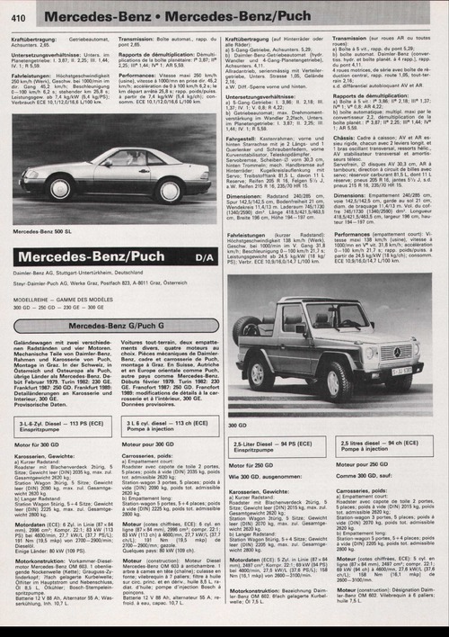 Geländewagen mit zwei verschiedenen Radständen und vier Motoren. Mechanische Teile von Daimler-Benz, Rahmen und Karosserie von Puch, Montage in Graz. In der Schweiz, in Österreich und Osteuropa als Puch, übrige Länder als Mercedes-Benz. Debüt Februar 1979. Turin 1982: 230 GE. Frankfurt 1987: 250 GD. Frankfurt 1989: Detailänderungen an Karosserie und Interieur, 300 GE. Provisorische Daten.