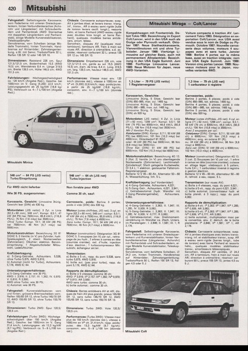 Kompaktwagen mit Frontantrieb. Debüt Tokio 1983. Bezeichnung im Export Colt/Lancer, wird in den USA auch als Dodge oder Plymouth verkauft. Oktober 1987: Neue Steilheckkarosserie, Vierventilmotoren mit und ohne Turbolader. Januar 1988: Viertürige Limousine auf gleicher Basis, auch mit permanentem Allradantrieb; Bezeichnung in den USA Eagle Summit. Juni 1988: Fünftürige Limousine Lancer. 1989: Neue Motoren für Japan, neue 4WD-Varianten.1,3-Liter - 79 PS (JIS netto) 1 Registervergaser
