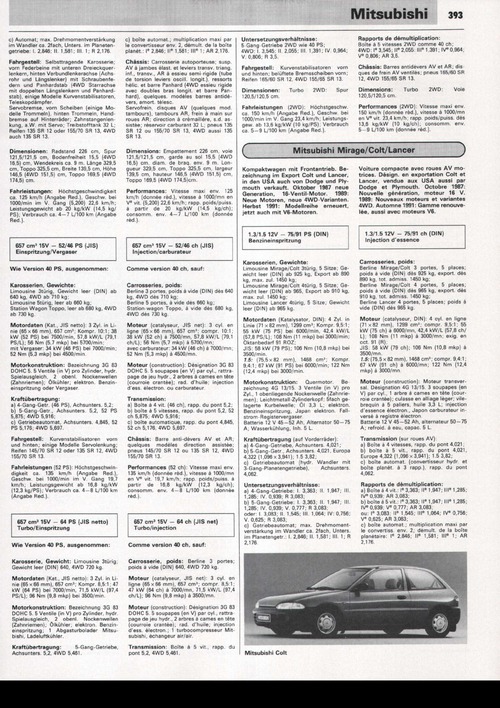 Kompaktwagen mit Frontantrieb. Bezeichnung im Export Colt und Lancer, in den USA auch von Dodge und Plymouth verkauft. Oktober 1987 neue Generation, 16 Ventil-Motor. 1989: Neue Motoren, neue 4WD-Varianten. Herbst 1991: Modellreihe erneuert, jetzt auch mit V6-Motoren.1.3/1.5 12V - 75/91 PS (DIN) Benzineinspritzung