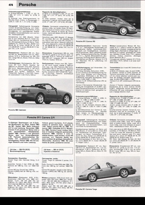 2+2-sitziger Sportwagen mit 6-Zylin der-Boxermotor im Heck. Debüt 1963 als 901. Herbst 1983: Mehr Hubraum (3,2 L) und Leistung. November 1988: Carrera 4 mit grösserem Motor (3,6 L) und permanentem Allradantrieb. Herbst 1989: Carrera 2 mit gleichem Motor, aber nur Hinterradantrieb, a.W. Tiptronic (automatisches Getriebe mit zusätzlicher manueller Schaltgasse). Herbst 1990: RS mit weniger Gewicht und mehr Leistung.