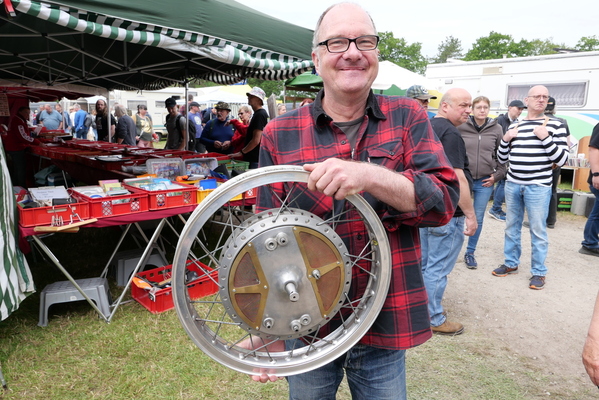 Es ist in der Tat schwierig, den Überblick zu behalten. Denn Schnäppchen lassen sich angesichts von rund 1000 Marktständen reichlich finden. So erging es Dirk aus Duisburg, der eine Yamaha-Trommelbremse für ein TZ-Rennmotorrad ergattert hat. Wieviel er dafür bezahlt hat, mag er nicht sagen. Aber sein Grinsen verrät, dass er ein sehr gutes Geschäft gemacht hat. Man kann auch ein abgerocktes Momo-Lenkrad für zehn Euro entdecken und noch so einiges mehr, aber wo fängt man an?