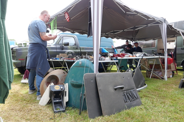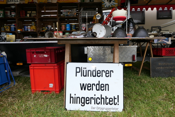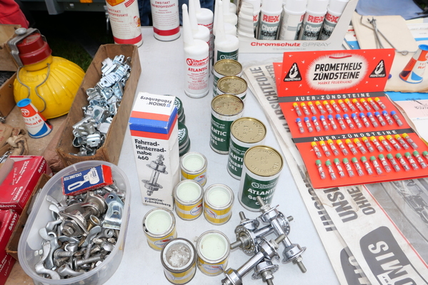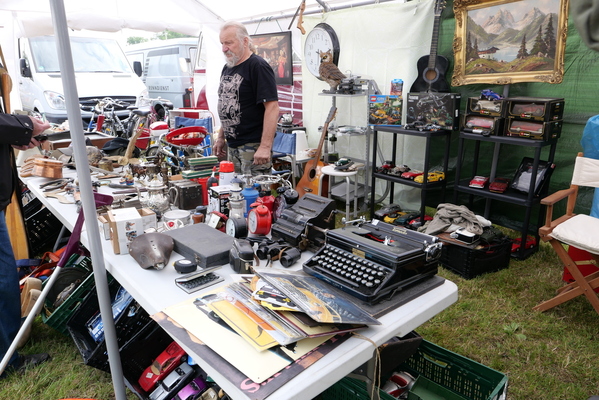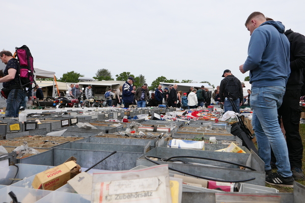 Am besten mit einem belegten Brötchen zum Frühstück an einer der gut organisierten Verpflegungsstationen. Und dazu den Kaffee aus der Porzellantasse – nicht aus einem Pappbecher. Danach arbeitet man sich Reihe für Reihe, Stand für Stand durch: Mopeds, Motorräder, Velos, Spielzeug, Deko, Klamotten, Antiquitäten – und Teile, soweit das Auge blicken kann.