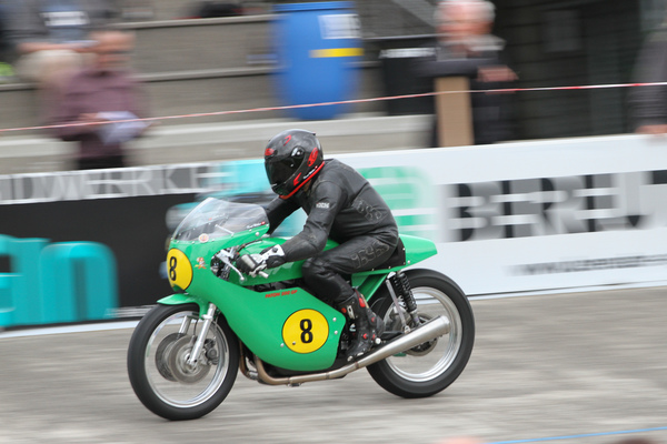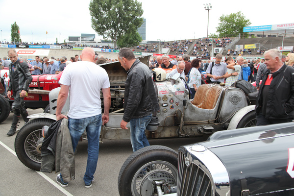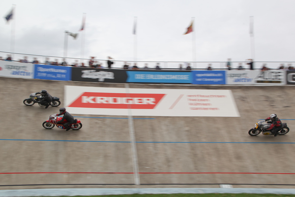 Dreimal drehten die neun historischen Rennfelder ihre Runden, dazwischen lieferten sich rasende Radrennfahrer mit modernstem Material Rad-an-Rad-Rennen.