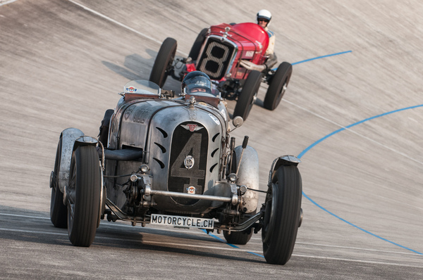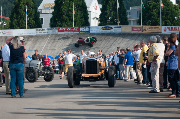 Trotzdem, eines muss man immer wieder erwähnen: sobald man die alte archaische Betonbahn sieht, wie sich die Steilwände gegen den Himmel recken, die Tribünen und die Treppchen dorthin noch aussehen wie früher, dann ist das ein ganz speziell schönes Gefühl. Authentisch eben, so wie die historischen Rennwagen, die im Innern des Ovals bereits nebeneinander aufgestellt warten und von Besuchern fleissig betrachtet und fotografiert werden…