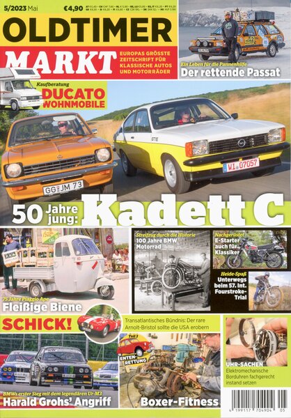 In der Mai-Ausgabe wird der 50. Geburtstag vom Opel Kadett C gefeiert. Dazu wird auch der 75. Geburtstag der Piaggio Ape und 100 Jahre BMW Motorrad gefeiert. Zusätzliche Berichte gibt es zum Oldtimer-Rallye-Mechaniker Hardy Leben, der mit seinem 1986er Passat alles gibt, um jeden ins Ziel zu bringen und zum raren Arnolt-Bristol. Erzählt wird auch über BMWs erster Sieg mit dem legendären Ur-M3. Dazu gibt es eine Kaufberatung zum Wohnmobil Fiat Ducato und zwei weitere Berichte sind dem E-Starter für Klassiker und der 57. Internationalen Fourstroke-Trial gewidmet. Die Restaurierung beschäftigt sich mit dem 3. Teil der Enten-Rettung; Boxer-Fitness.