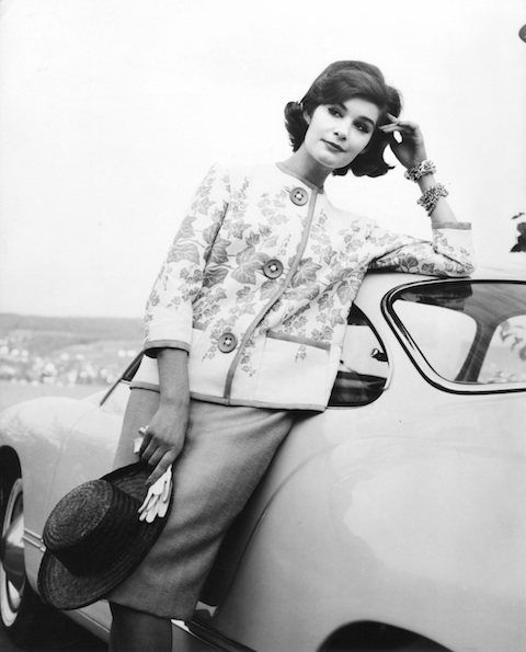 Ferienmode aus den früheren Sechzigerjahren wurde auf diesem Bild verewigt. Und, wie es oft angewandt wird in der Modefotografie, lehnt sich die selig in die Ferne blickende junge Dame, eingekleidet in Jupe und Jäckchen von Geny Spielmann, an ein Automobil, das nur knapp erkennbar ist und trotzdem mit seinen Rundungen und glänzenden Flächen viel Atmosphäre verleiht.