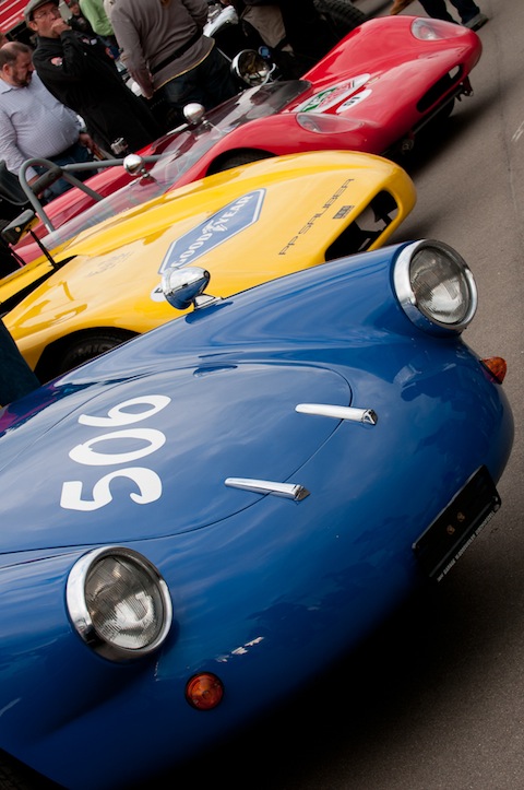 18 Motorräder, 9 Gespanne (mit Morgan Three Wheeler) und 21 historische Strassen- und Rennwagen stehen in zwei Reihen im Innenraum bereit. Meistens sitzen oder stehen die Fahrer und Besitzer gleich neben ihrem Fahrzeug und sind immer offen für Fragen und kurze Diskussionen: