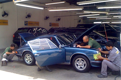 Eine Putzequipe von fünf Brasilianern bringt in Sao Paulo einen blauen Porsche 911E 2,4 auf Hochglanz.