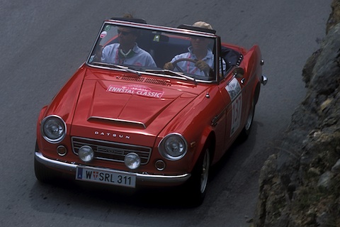 Auf dem Bild sehen wir Nissan-Österreich-Chdf Takayuki Uchida im Datsun Fairlady 2000 von 1968. Der Zweiliter-Motor entwickelte 135 SAE-PS und trieb den Wagen auf fast 200 km/h Höchstgeschwindigkeit. Das ursprünglich in die USA exportierte Auto wurde irgendwann von einem Nissan-Händler in Kushiro zurück nach Japan geholt und dann vollständig restauriert. Im März 2003 kam der rote Sportwagen dann per Container nach Oesterreich.