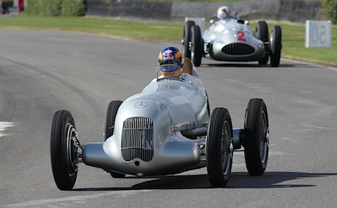 Karl Wendlinger, der ehemalige Sauber F1-Pilot, startete mit dem Mercedes-Benz W25 beim Demonstrationsfahren der Silberpfeile am Goodwood Revival 2012.